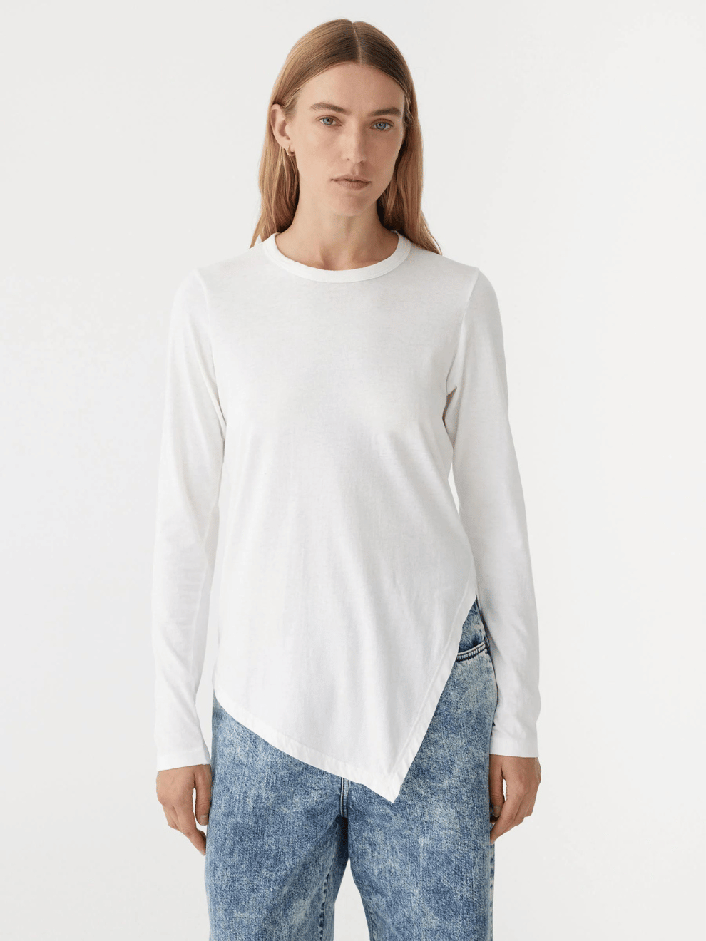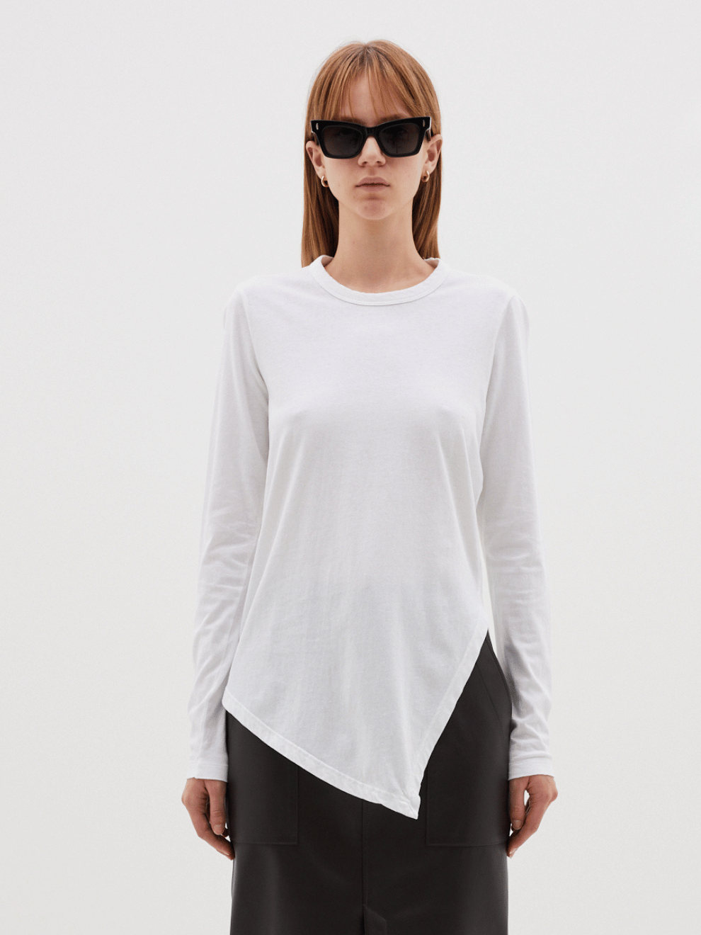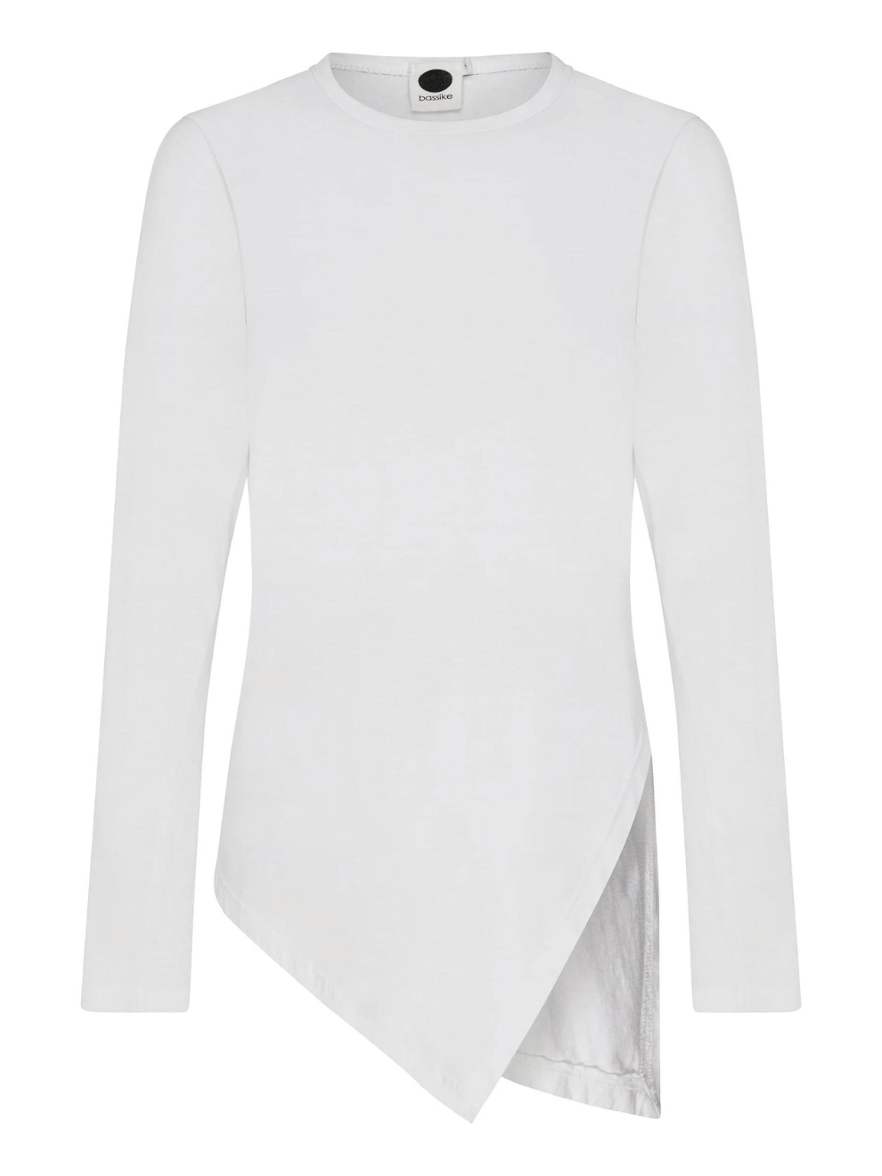 Crafted from organic cotton jersey, the asymmetric split long sleeve t.shirt is designed for a slim fit. This lightweight style features a classic scoop neck and side split an asymmetric fit. Complete with signature Bassike contrast topstitching along the back.
