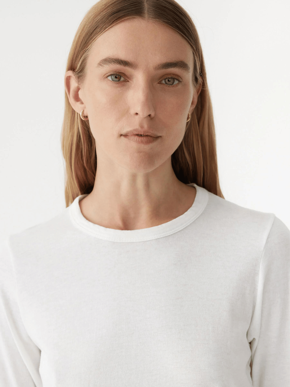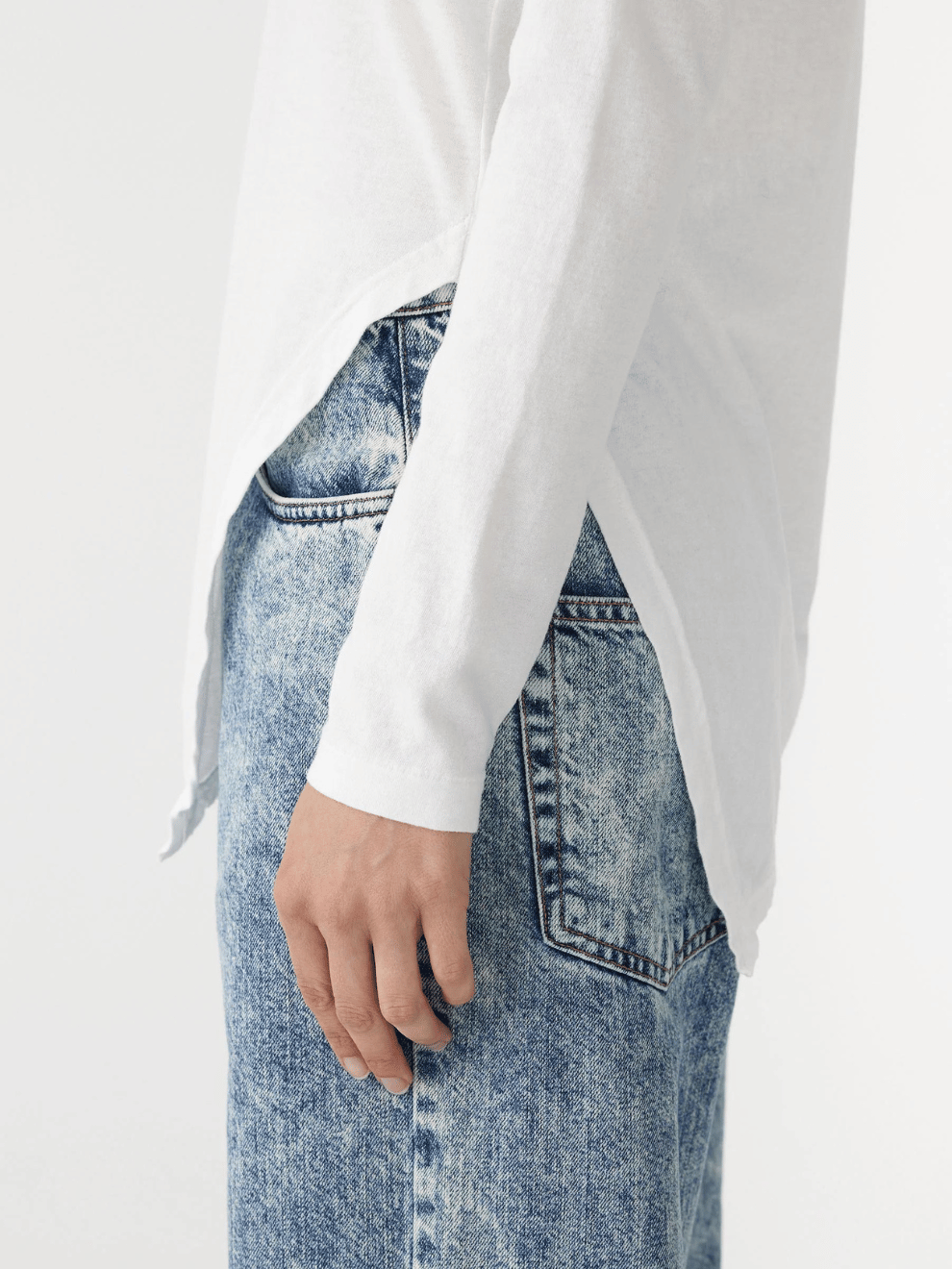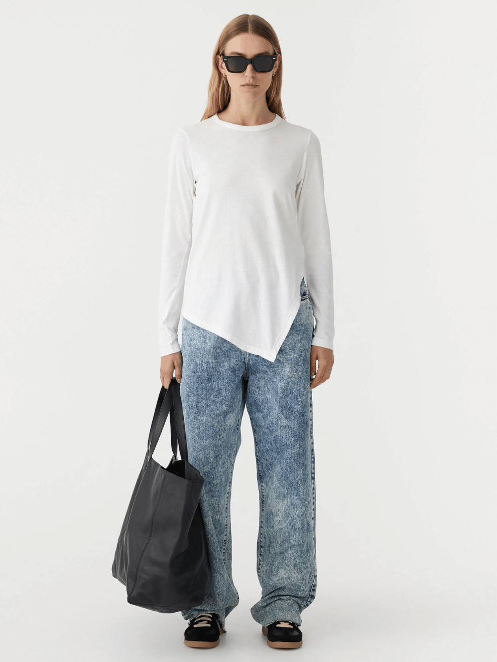 Crafted from organic cotton jersey, the asymmetric split long sleeve t.shirt is designed for a slim fit. This lightweight style features a classic scoop neck and side split an asymmetric fit. Complete with signature Bassike contrast topstitching along the back.