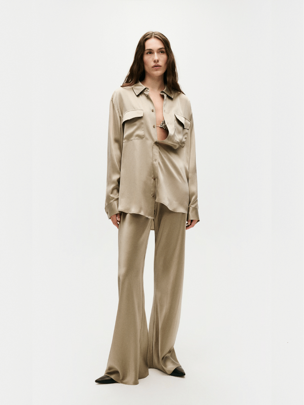 Silk Laundry's everyday pant, cut from 100% Silk Satin. A signature style that falls into a fluid silhouette with a slight flare. Its elasticated waistband sits high above the hip, pulling in to highlight the waistline. Combining elegance, comfort and style, it's a piece that will complement any wardrobe. Pair this piece with the Boyfriend Shirt in Graphite as pictured.