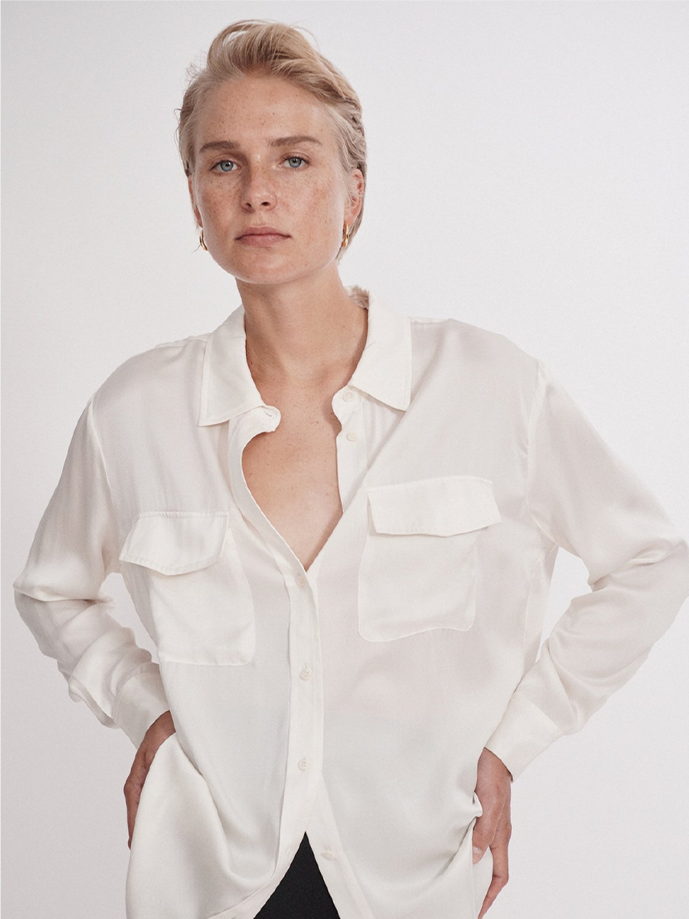 Silk Laundry have designed the Boyfriend Shirt to echo an original menswear style, cut from a glossy sandwashed silk, this everyday shirt looks great half-tucked into a tailored pant or left loose over our Bias Cut Pant. The relaxed fit is paired with a button-down front and utility pockets to create the versatility needed in everyday life.