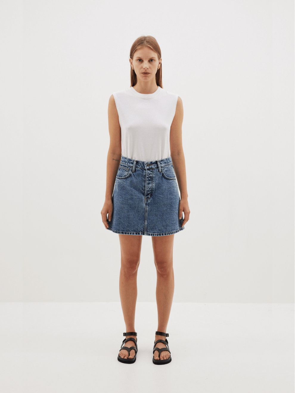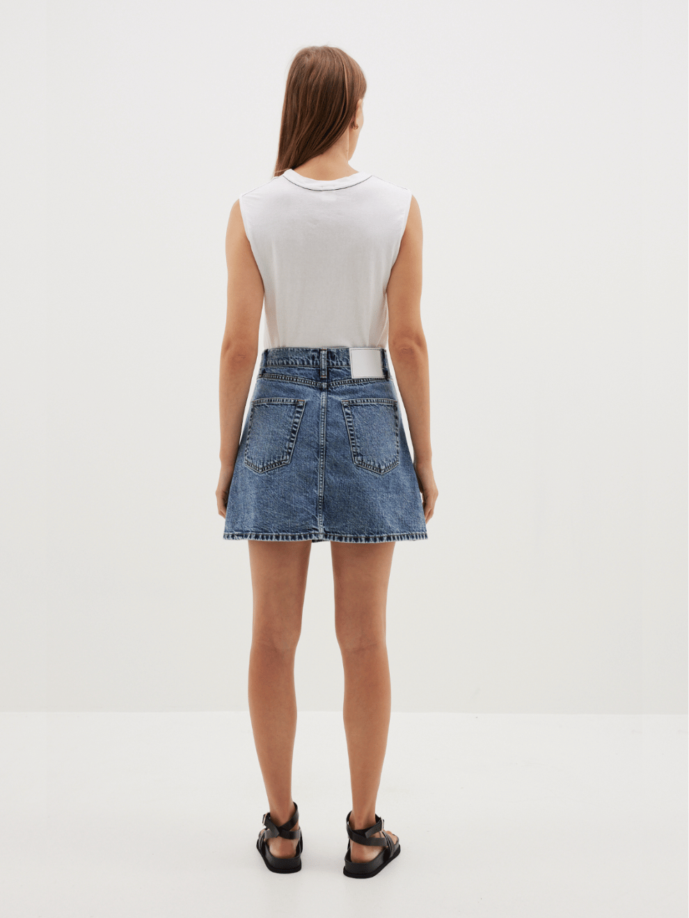 High waisted mini skirt, classic 5 pocket detailing, denim make all over, bassike denim shank button at centre front with a concealed button fly, self belt loops, back patch pockets
