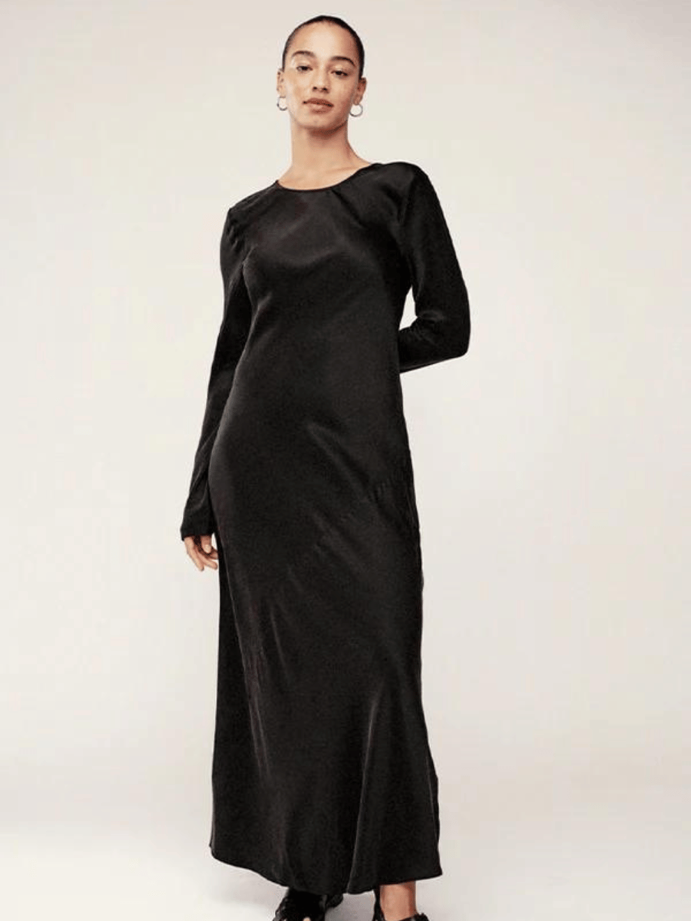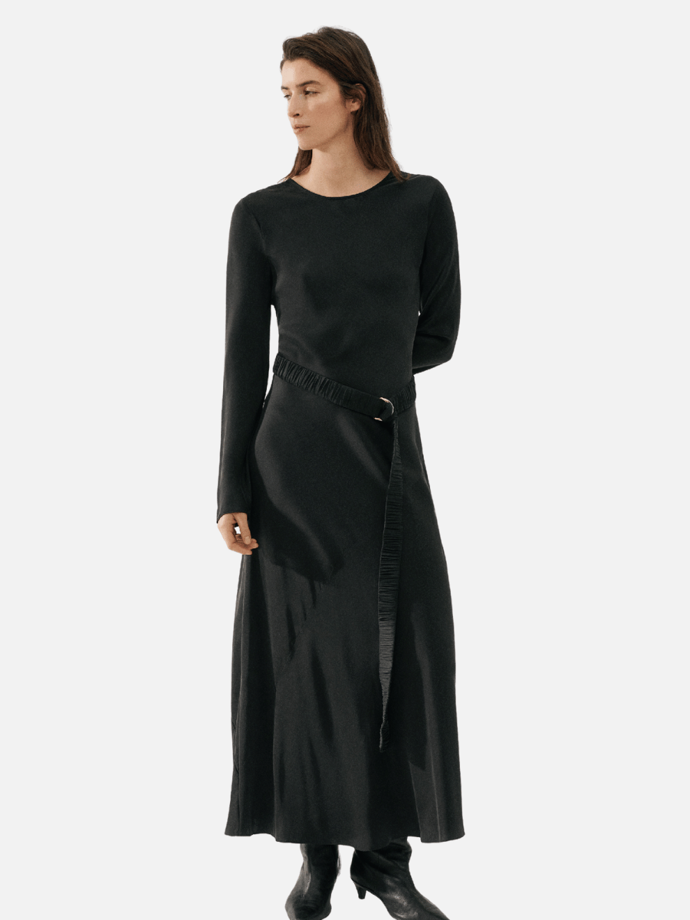 This Silk Laundry dress offers the perfect balance between a minimalist and statement piece. This elegant full-length sleeve style allows for wear all year round. A high neckline featuring a soft scoop highlights the nape of the neck and the bias cut flatters the natural curves of the body.