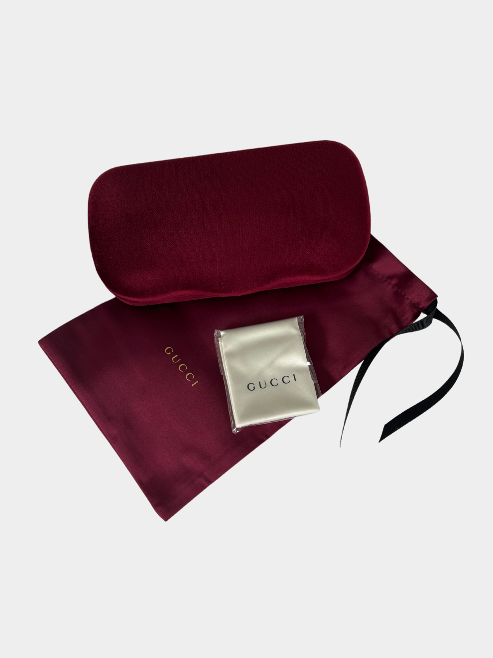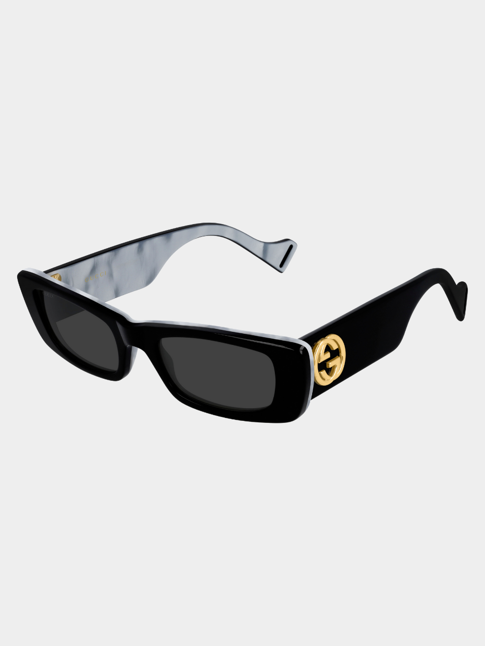 Black Acetate frame outer and pearlescent shell look on the interior. These bold framed sunglasses with a large GG logo at temples and tilted, overhanging temple arm design will look especially flattering on round faces.