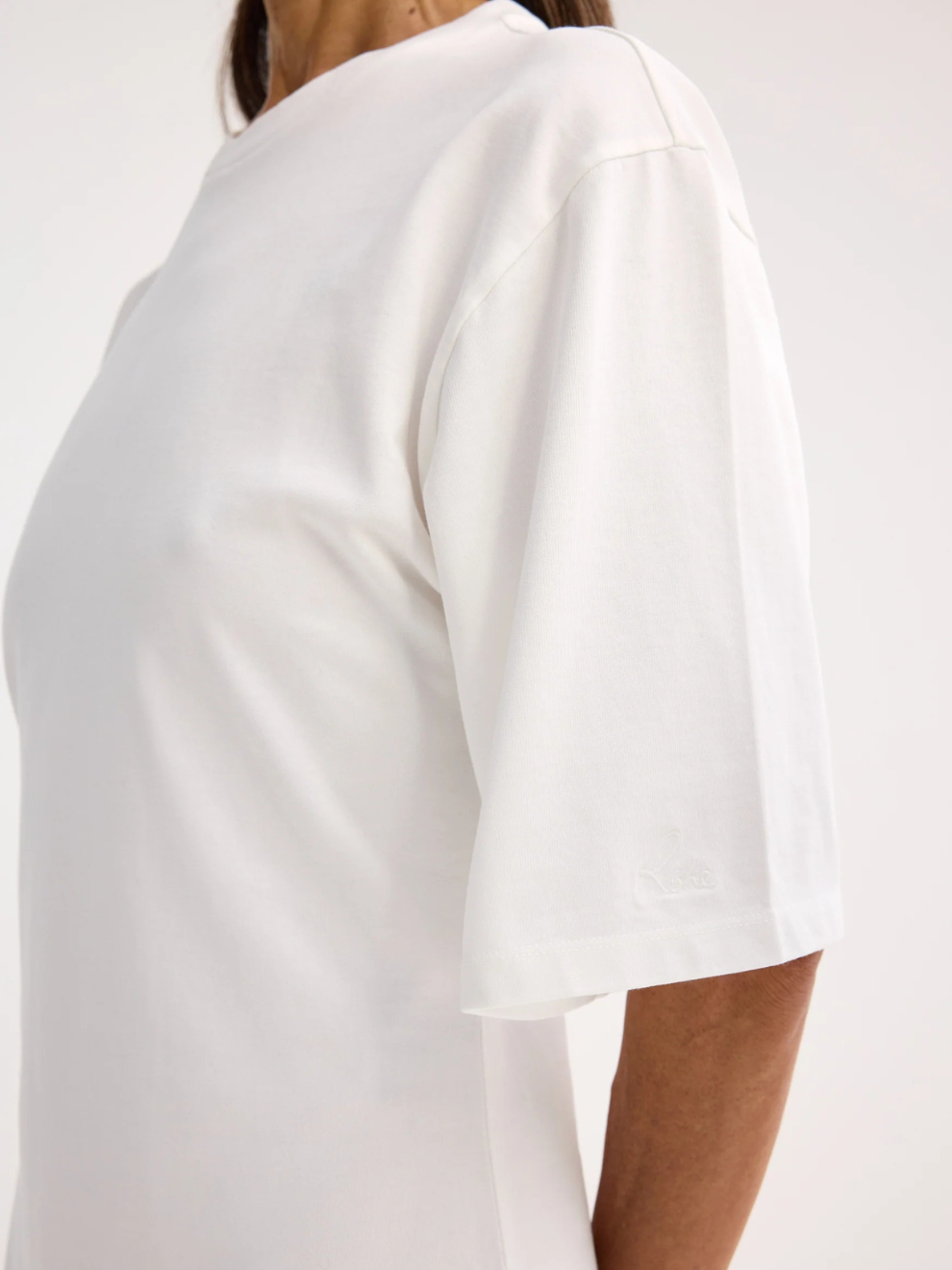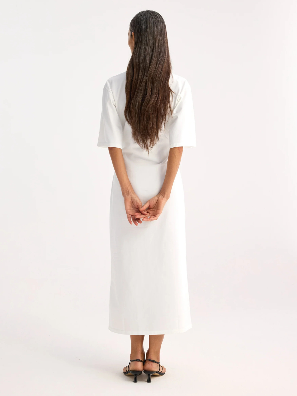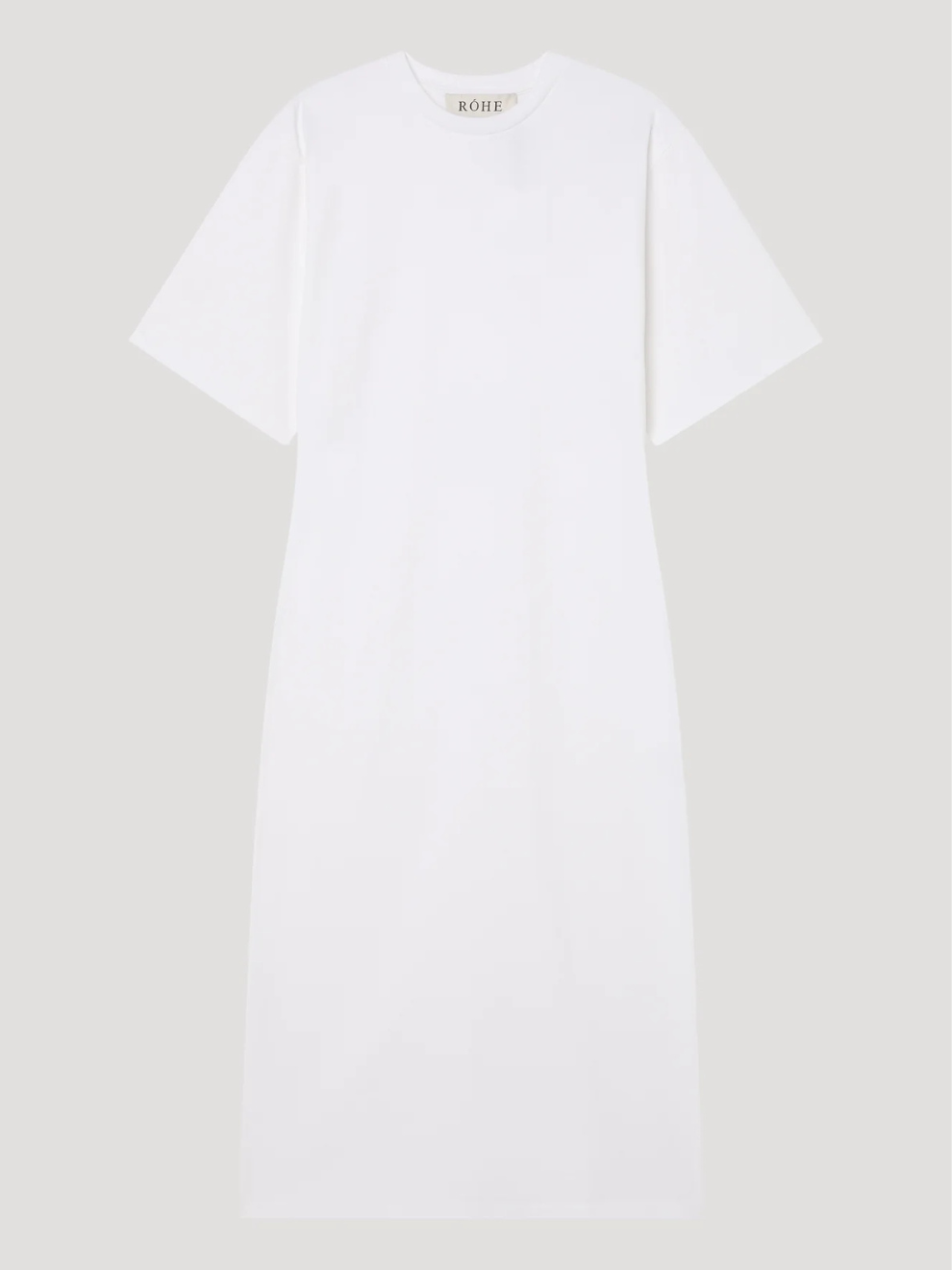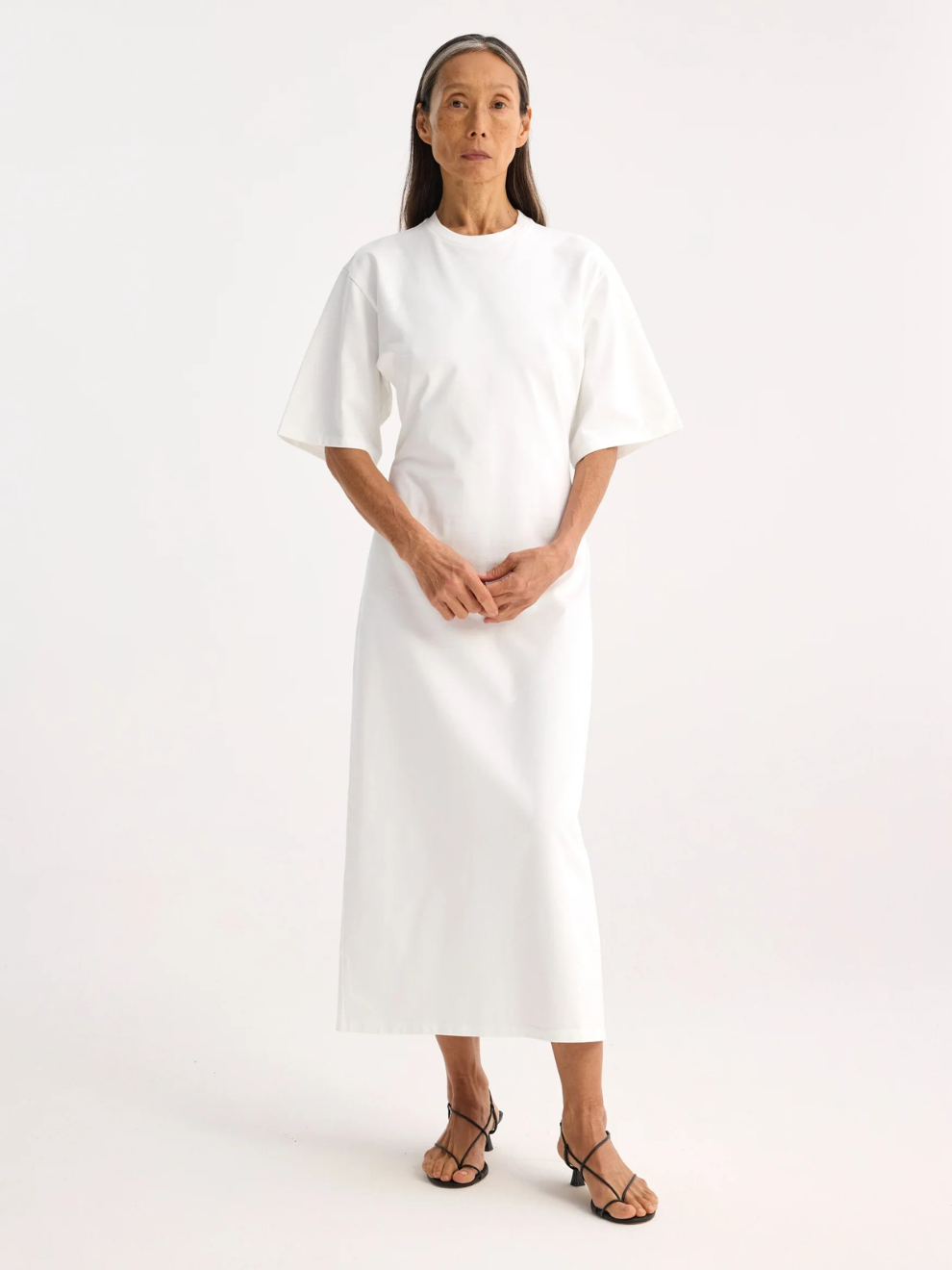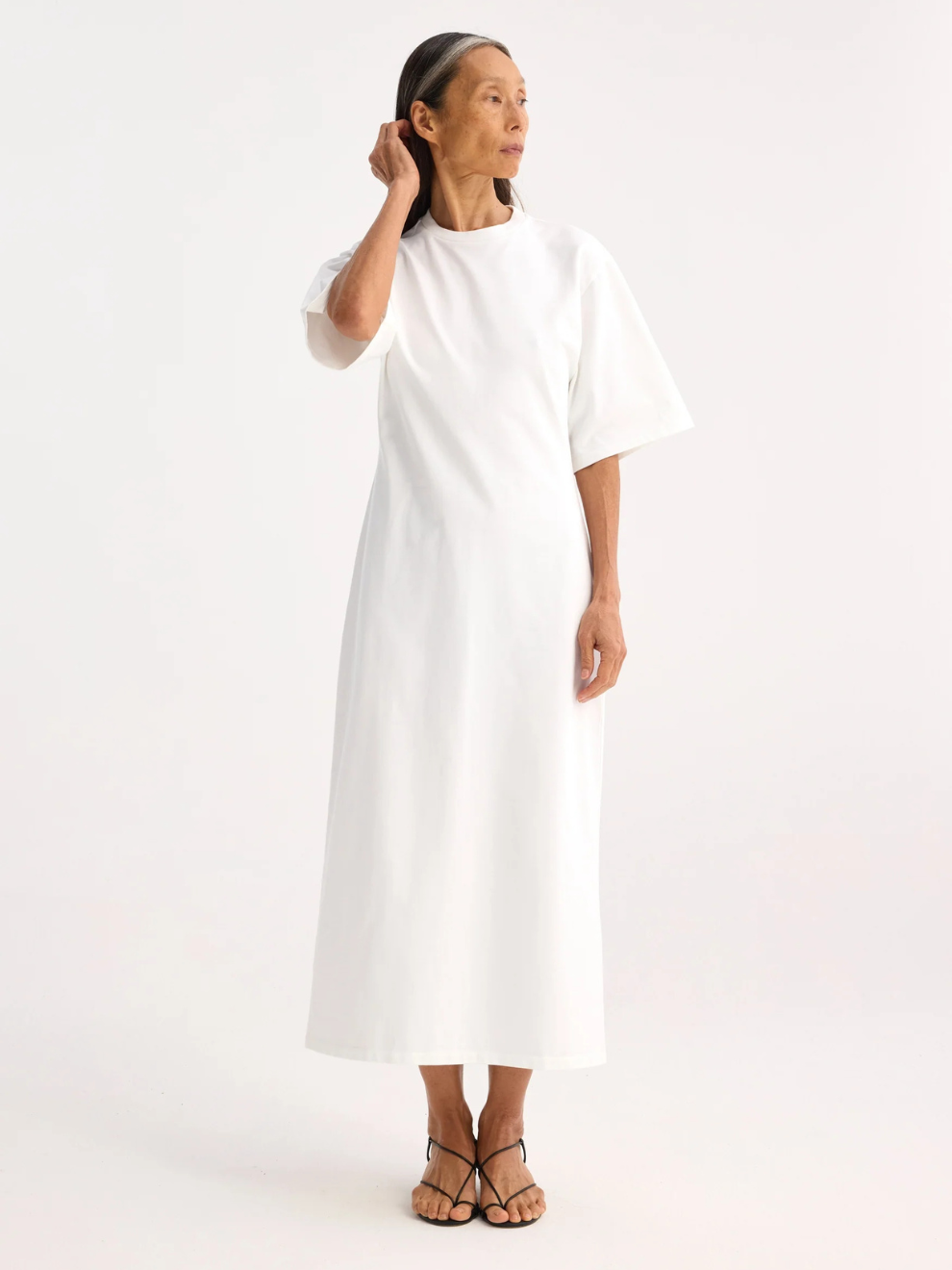 A classic t-shirt dress silhouette crafted from a soft and lightweight jersey fabric. The design offers ultimate comfort with an ankle-length shape, relaxed crew neck, short sleeve and slightly fitted at the waistline. Made in a pure crisp white organic cotton.