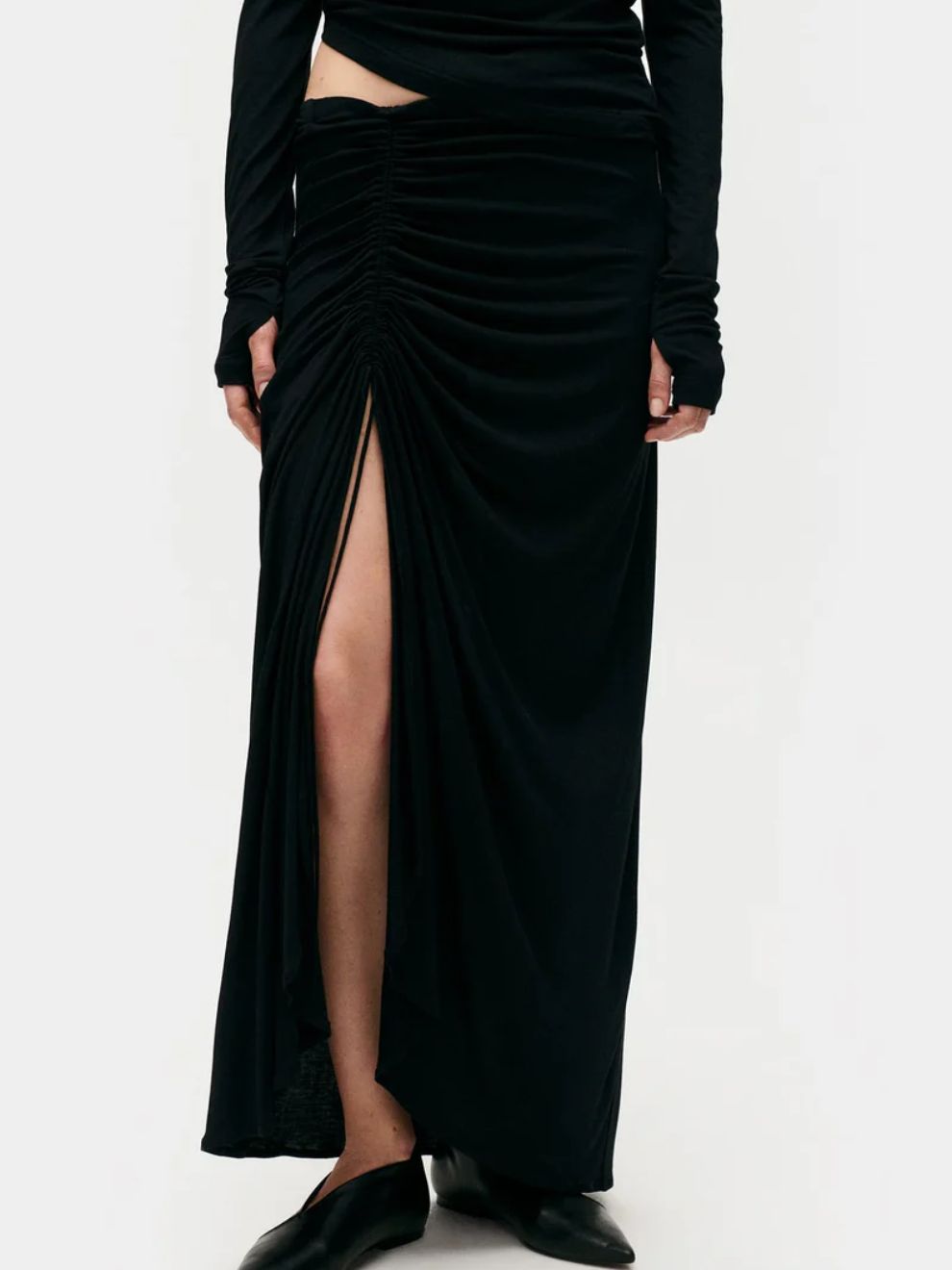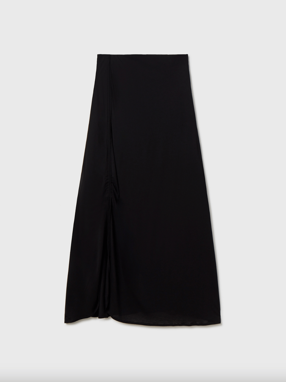 This midi skirt features adjustable ruching detail at the side, allowing you to customize the length of the slit, with an elastic waistband for a comfortable fit.