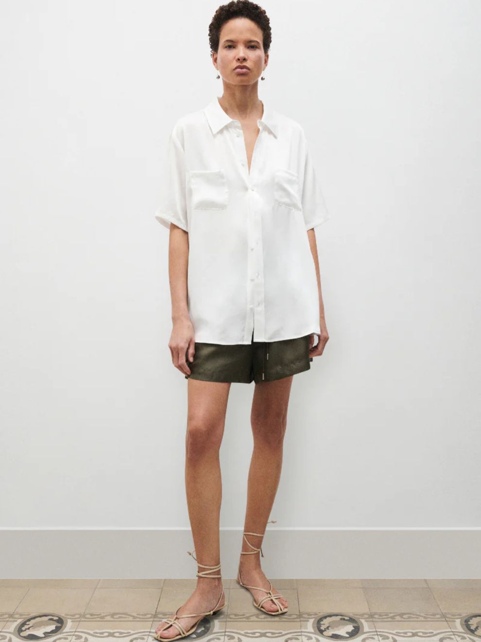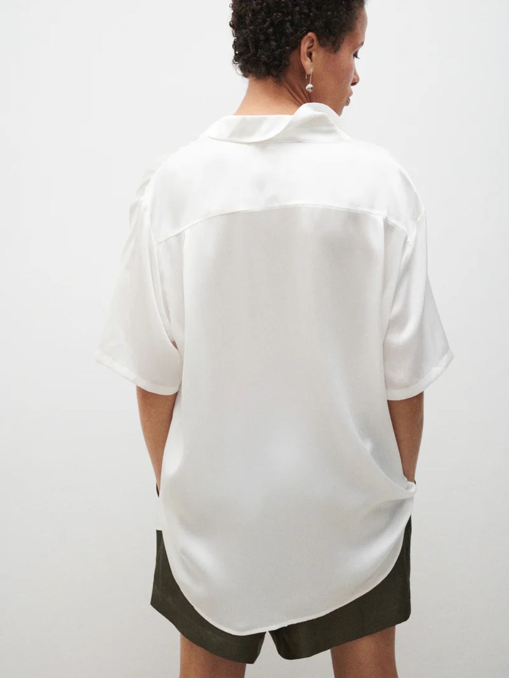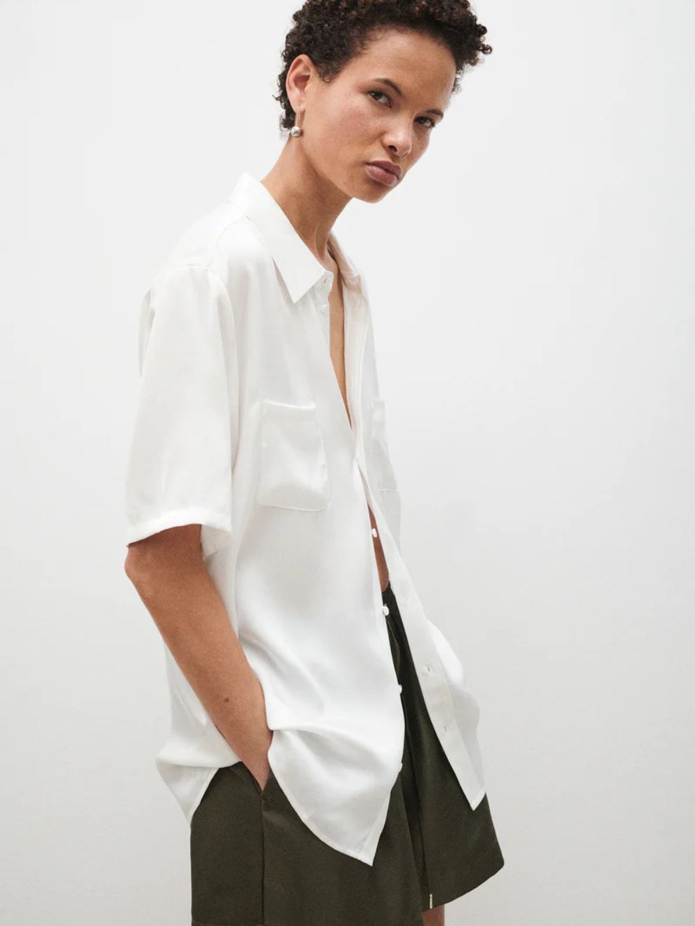 Designed to echo an original menswear style, cut from a glossy sandwashed silk. A relaxed fit is paired with a button-down front and utility pockets to create the versatility needed in everyday life.