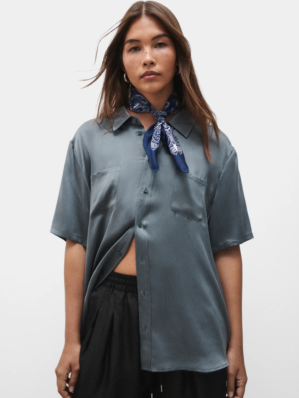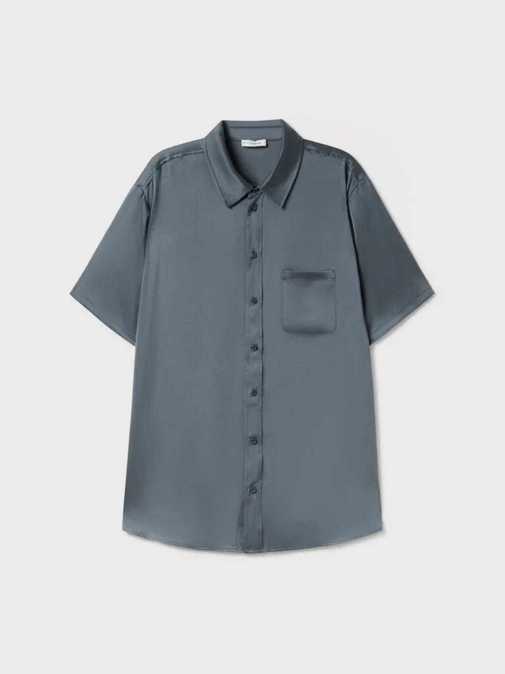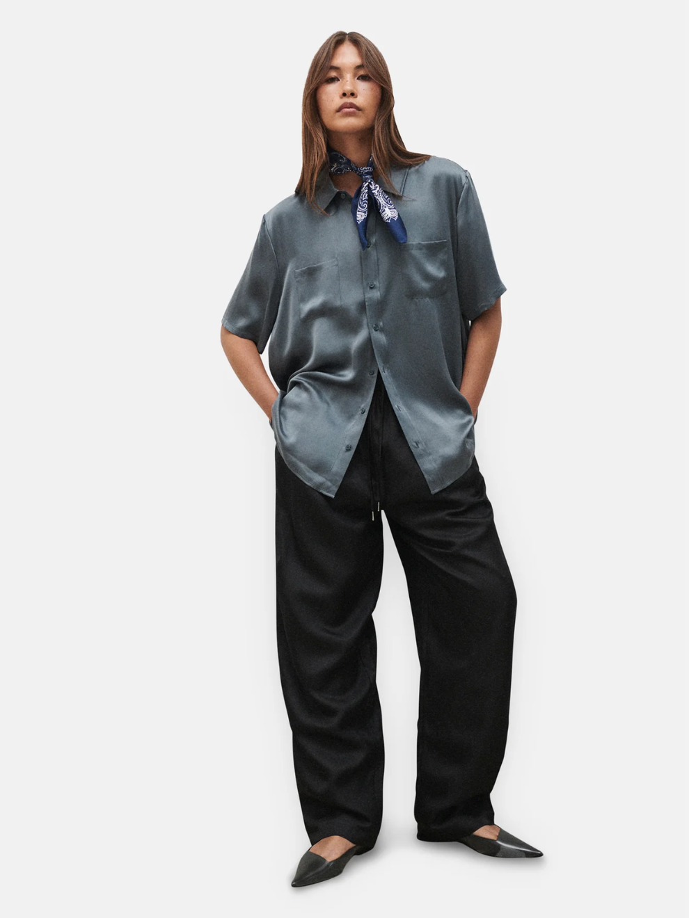 Designed to echo an original menswear style, cut from a glossy sandwashed silk. A relaxed fit is paired with a button-down front and utility pockets to create the versatility needed in everyday life. Perfect half-tucked into a mini skirt or pants, or worn half-buttoned over a slip dress. Pair this piece with the Silk Twill Slouch Pants in Black as pictured, OR with the Bias Cut Pants in Slate for a matching set.