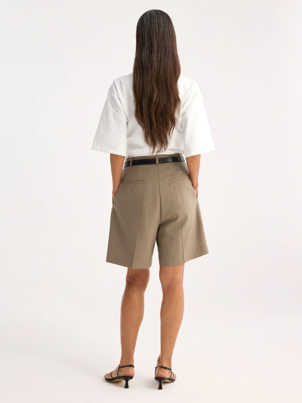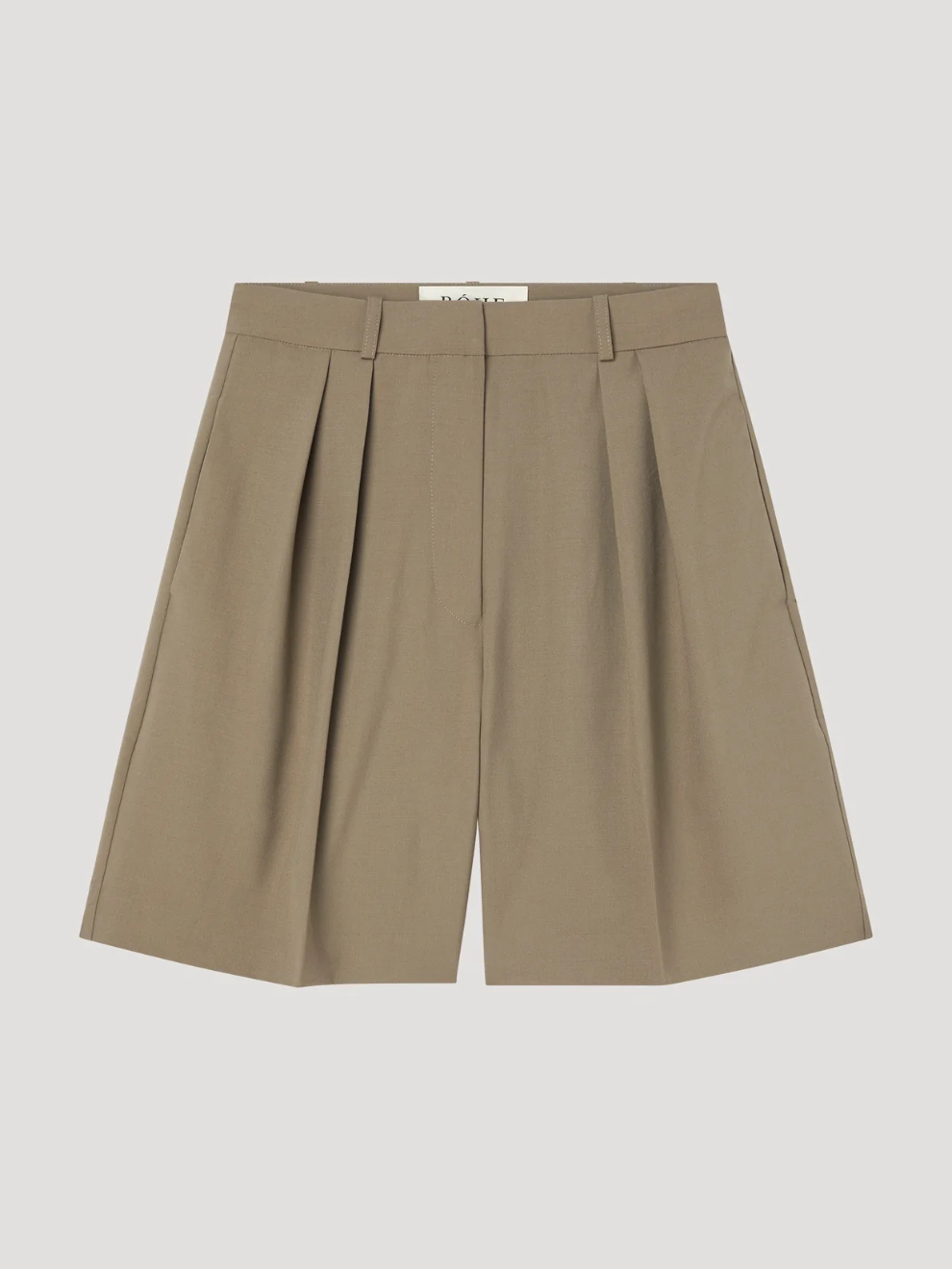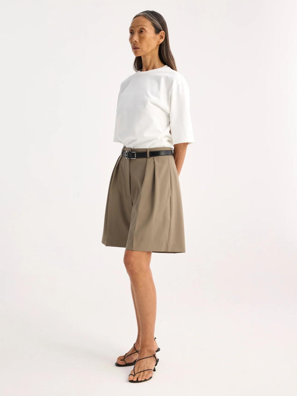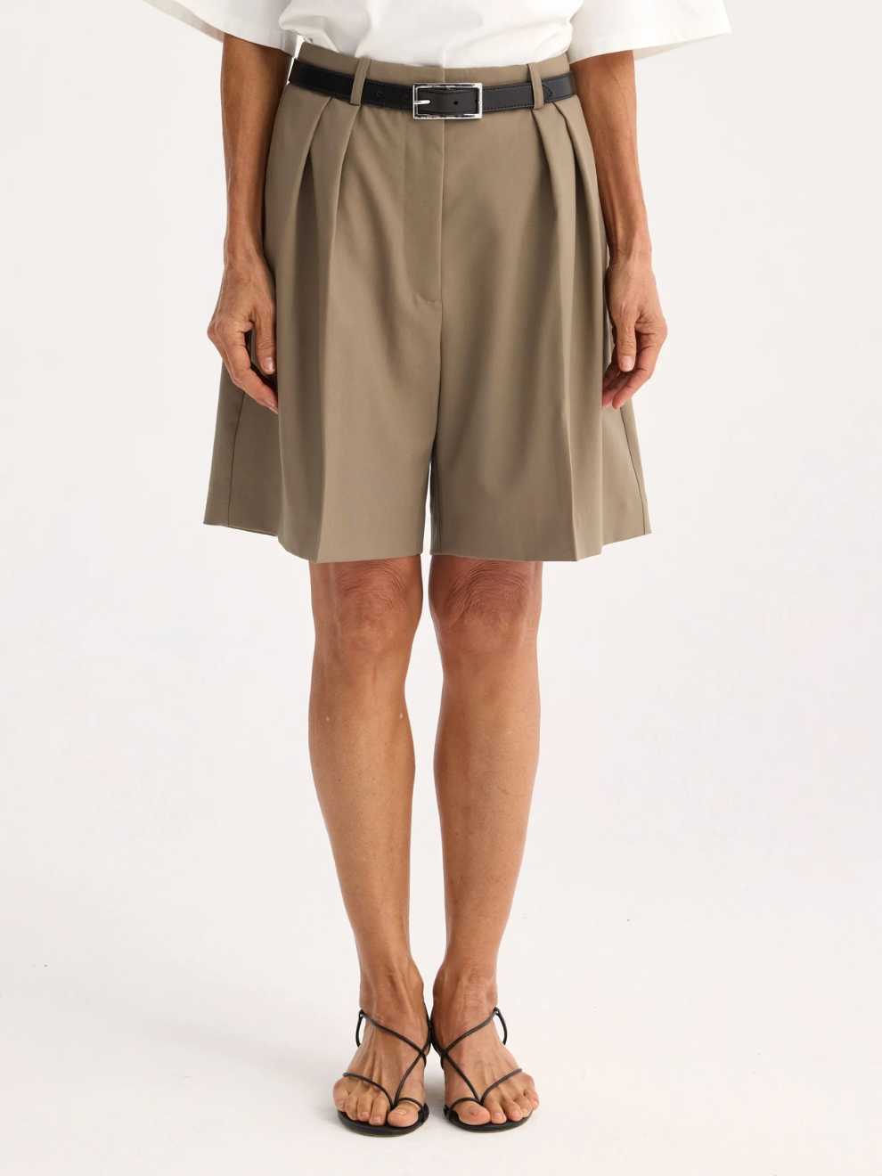 Tailored shorts featuring double pleats at the front and back, designed with a high waistband and belt loops for a structured fit. Crafted from a pure virgin wool fabric with functional detailing in the side seam pockets and back welt pockets for a refined finish. Pair with the Rohe Classic T Shirt in White as pictured.