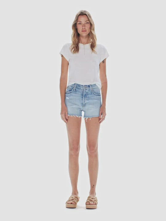 Tell the truth. MOTHER's bestselling high-waisted jean shorts with a button fly and a frayed hem. Made from semi-rigid SUPERIOR denim, True Confessions is a light wash with subtle distressing for a worn-in look.